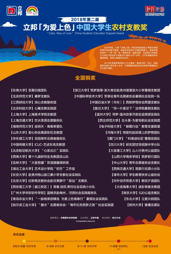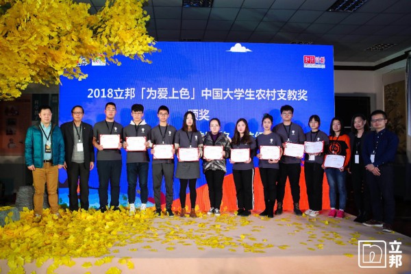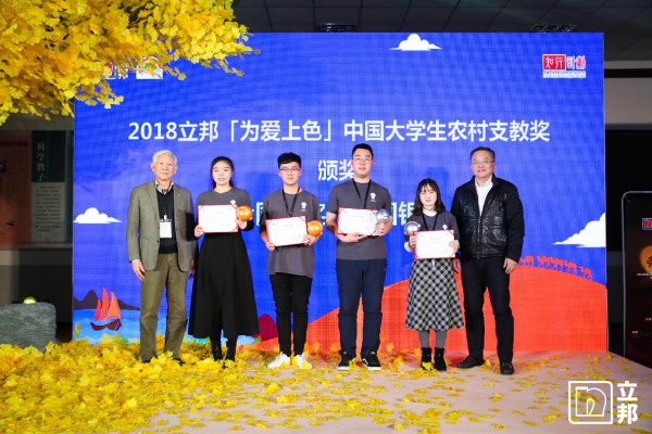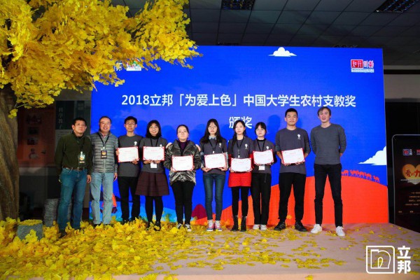 颁奖典礼上揭晓了2018年立邦「为爱上色」中国大学生农村支教奖获奖名单,中南大学为爱而艺·文艺支教团和河北工业大学“七彩微光”大学生支教团获得金奖;安徽理工大学筑心绘梦团队、重庆大学五彩课堂支教实践团、同济大学“新纪元-Era”元谋梦想教室实践团、兰州大学甘南行暑期社会实践团、武汉大学“卫水而生”志愿服务队、西安交通大学“恒如”支教队、中国人民大学“八千里路云和月”、天津大学雏凤清鸣实践队获得银奖。此外,还评选出全国铜奖40名,校级优秀奖50名,最佳传播奖4名,最佳视频奖4名。