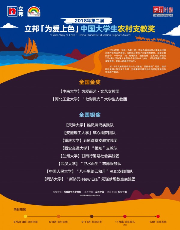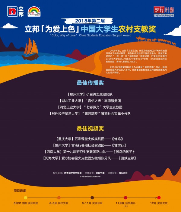 2017年,立邦中国加入共青团中央学校部“中国大学生社会实践知行促进计划”,结合“一带一路”和“精准扶贫”国家战略,以及响应十九大建设“美丽中国”号召,开展“立邦「为爱上色」中国大学生农村支教奖”。组织高校大学生志愿者,进行乡村支教及建筑遗产调研活动。经过2年的开展,支教奖进一步拓宽了大学生的公益实践平台,对大学生树立正确的价值观和人生理想、培养社会责任心具有深远的意义价值。