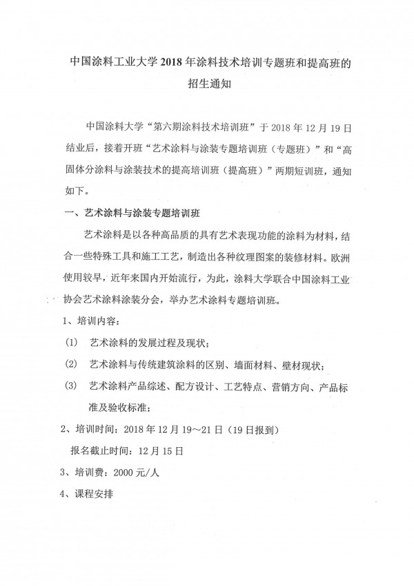中国涂料大学“第六期涂料技术培训班”于2018年12月19日结业后,接着办“艺术涂料与涂装专题培训班(专题班)”和“高固体分涂料与涂装技术的提高培训班(提高班)”两期短训班,通知如下。