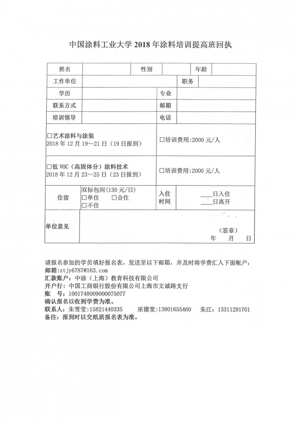 中国涂料工业大学2018年涂料培训提高班回执