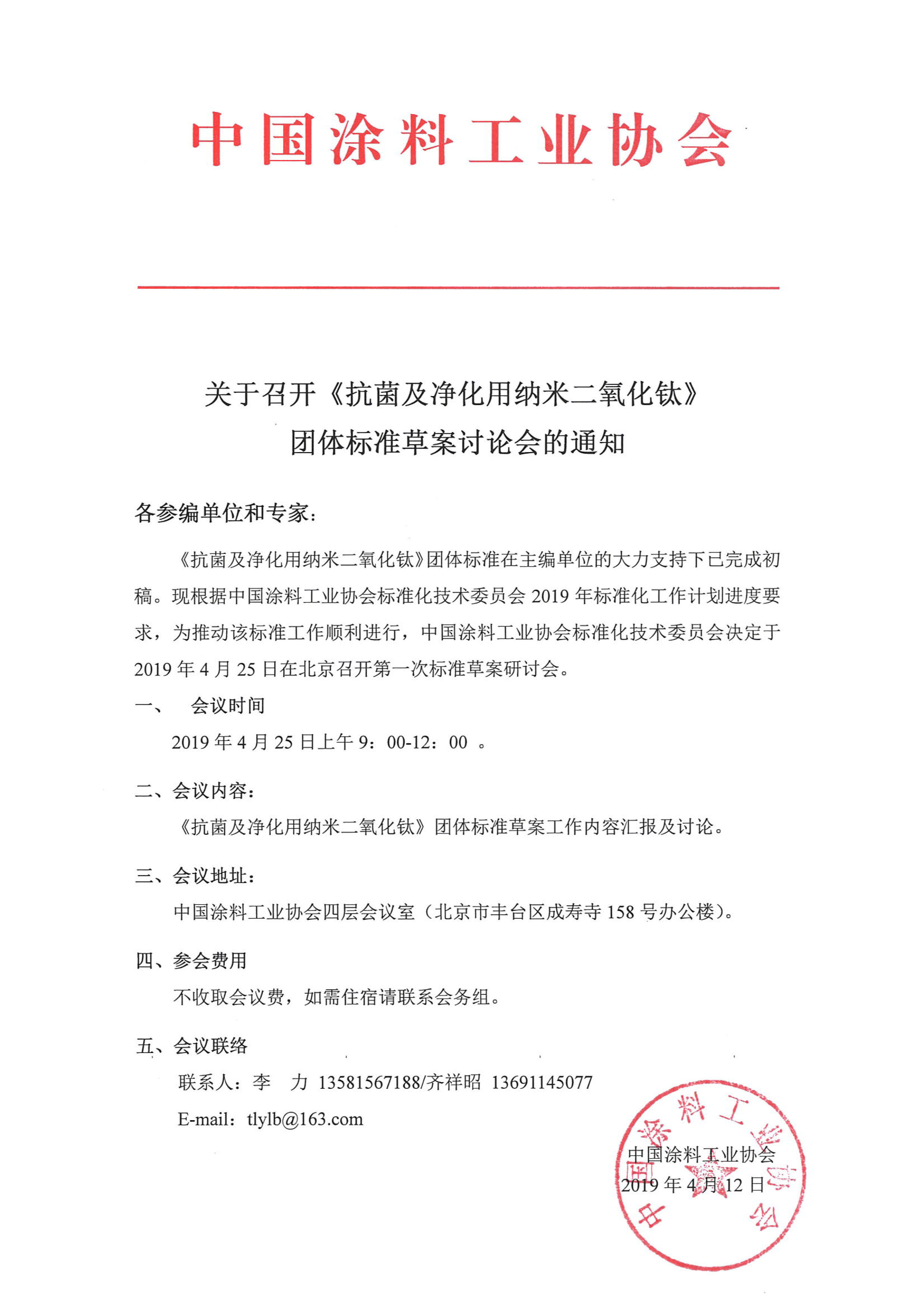《抗菌及净化用纳米二氧化钛》团体标准在主编单位的大力支持下已完成初稿。现根据best365中国官方网站标准化技术委员会2019年标准化工作计划进度要求,为推动该标准工作顺利进行,best365中国官方网站标准化技术委员会决定于2019年4月25日在北京召开第一次标准草案研讨会。