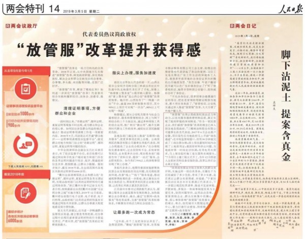 “放管服”改革以简政放权放出活力和动力,以优化服务提供便利和品质,真正实现了政府职能的深刻转变。“作为一家民营企业,我们感到‘放管服’改革的理念已深入到各地各级政府。”三棵树涂料股份有限公司董事长洪杰代表说,2017年6月企业落户安徽,项目签约后当地政府马上开辟“绿色通道”:在市场监管局窗口,仅用30分钟就完成了工商注册办理;国土局在最短时间内办理了土地使用证;遇到原材料供应问题,当地政府第一时间走访协调;有用电用水需求,马上架设临时施工变压器和水阀接头,“7月项目土建工程正式开工,当年12月即进入全面封顶和设备安装阶段,改革让我们企业真正受益。”(相关阅读——今天,明光登上了人民日报!)