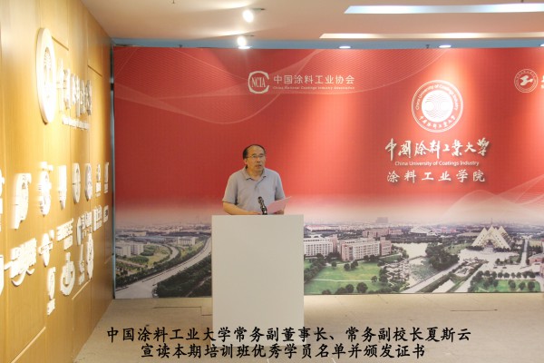 中国涂料工业大学常务副董事长、常务副校长夏斯云宣读本期培训班优秀学员名单并颁发证书。中国涂料工业大学名誉副校长刘国杰老师、中国涂料工业大学副校长、上海工程技术大学研究生处处长徐菁利老师、中国涂料工业大学副校长、上海工程技术大学化工学院院长饶品华老师为培训班全体学员颁发结业证书仪式。