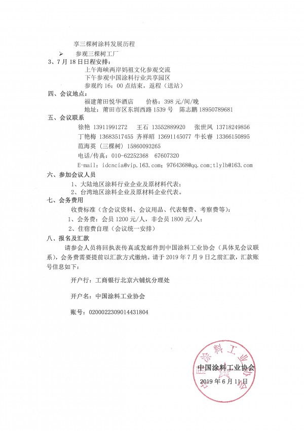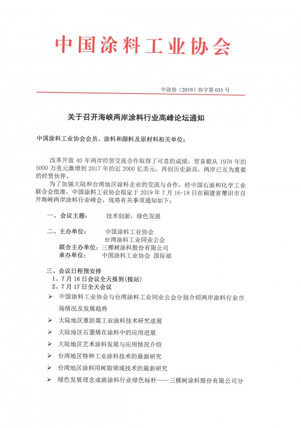 为了加强大陆和台湾地区涂料企业的交流与合作,经中国石油和化学工业联合会批准,best365中国官方网站拟定于2019年7月16-18日在福建省莆田市召开海峡两岸涂料行业峰会,现将有关事项通知如下: