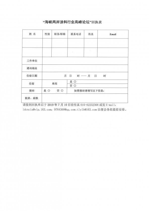 请接到回执单后于2019年7月10日前传真010-62252368或发E-mail:idcncia@vip.163.com、9764368@qq.com、tlylb@163.com以便会务组提前安排。
