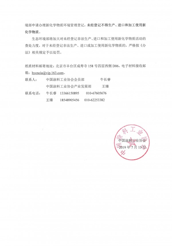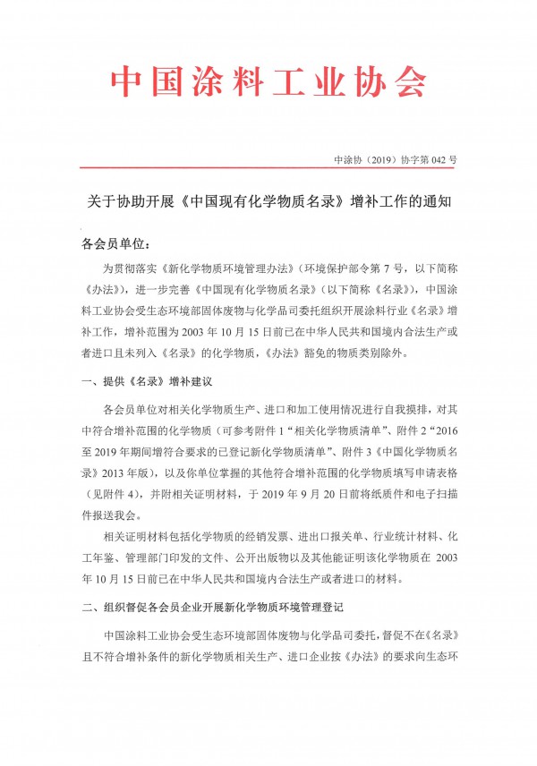 各会员单位对相关化学物质生产、进口和加工使用情况进行自我摸排,对其中符合增补范围的化学物质(可参考附件1“相关化学物质清单”、附件2“2016至2019年期间增符合要求的已登记新化学物质清单”、附件3《中国化学物质名录》2013年版),以及你单位掌握的其他符合增补范围的化学物质填写申请表格(见附件4),并附相关证明材料,于2019年9月20日前将纸质件和电子扫描件报送我会。