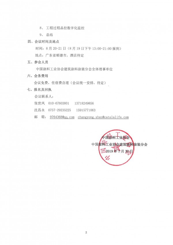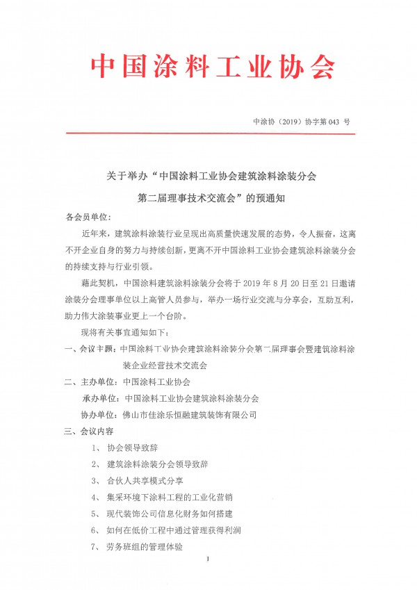 藉此契机,中国涂料建筑涂料涂装分会将于2019年8月20日至21日邀请涂装分会理事单位以上高管人员参与,举办一场行业交流与分享会,互助互利,助力伟大涂装事业更上一个台阶。