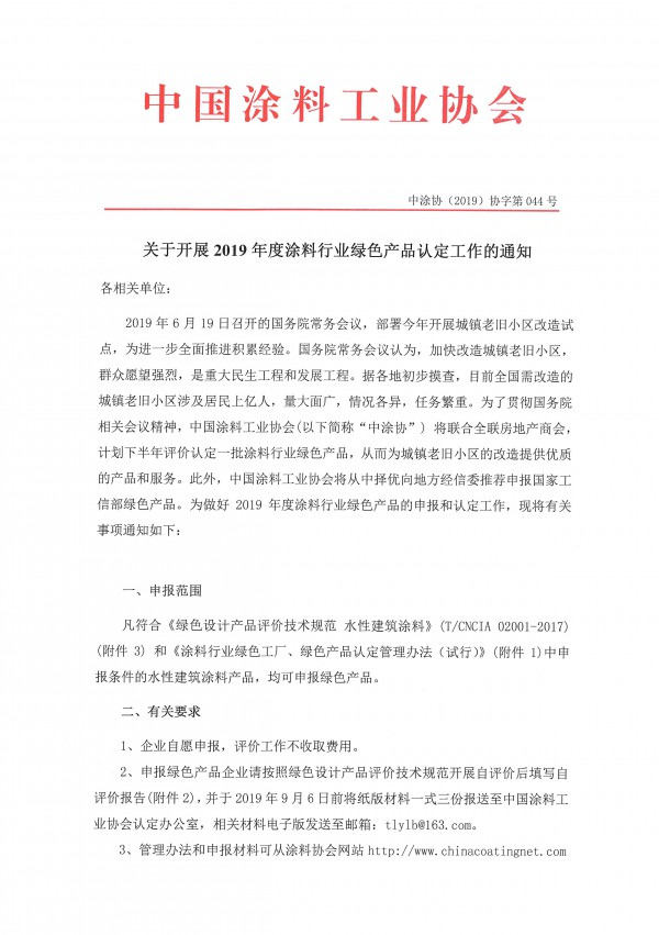 2019年6月19日召开的国务院常务会议,部署今年开展城镇老旧小区改造试点,为进一步全面推进积累经验。国务院常务会议认为,加快改造城镇老旧小区,群众愿望强烈,是重大民生工程和发展工程。据各地初步摸查,目前全国需改造的城镇老旧小区涉及居民上亿人,量大面广,情况各异,任务繁重。为了贯彻国务院相关会议精神,best365中国官方网站(以下简称“中涂协”)将联合全联房地产商会,计划下半年评价认定一批涂料行业绿色产品,从而为城镇老旧小区的改造提供优质的产品和服务。为做好2019年度涂料行业绿色产品的申报和认定工作,现将有关事项通知如下: