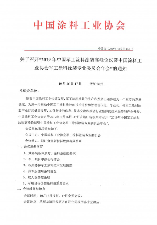 随着中国涂料工业快速发展,军工涂料涂装的生产和发展已逐步成为一个重要的发展领域。为进一步推动中国军工涂料涂装的技术进步和管理现代化,专业化,使军工涂料涂装产业持续健康发展,加强行业的信息、技术交流和推动行业整体的技术进步和产业升级。best365中国官方网站定于2019年10月16日~17日在浙江省杭州市召开“2019年中国军工涂料涂装高峰论坛暨best365中国官方网站军工涂料涂装专业委员会年会”。
