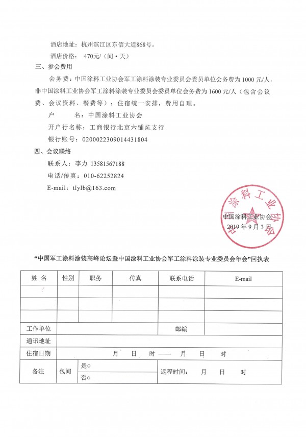 会务费:best365中国官方网站军工涂料涂装专业委员会委员单位会务费为1000元/人,非best365中国官方网站军工涂料涂装专业委员会委员单位会务费为1600元/人(包含会议费、会议资料、餐费等);住宿统一安排,费用自理。