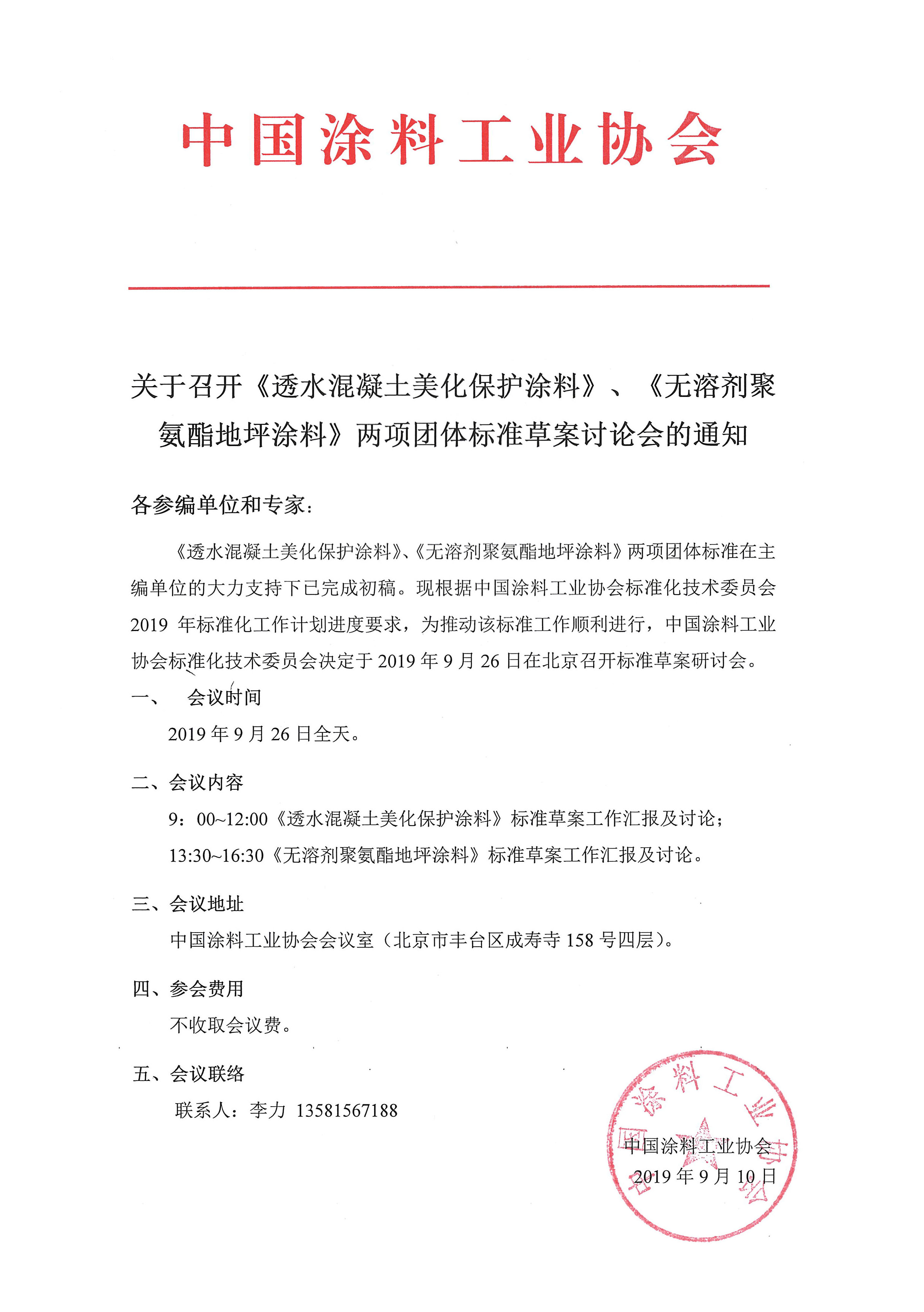 《透水混凝土美化保护涂料》、《无溶剂聚氨酯地坪涂料》两项团体标准在主编单位的大力支持下已完成初稿。现根据best365中国官方网站标准化技术委员会2019年标准化工作计划进度要求,为推动该标准工作顺利进行,best365中国官方网站标准化技术委员会决定于2019年9月26日在北京召开标准草案研讨会。