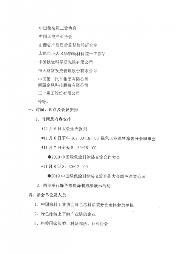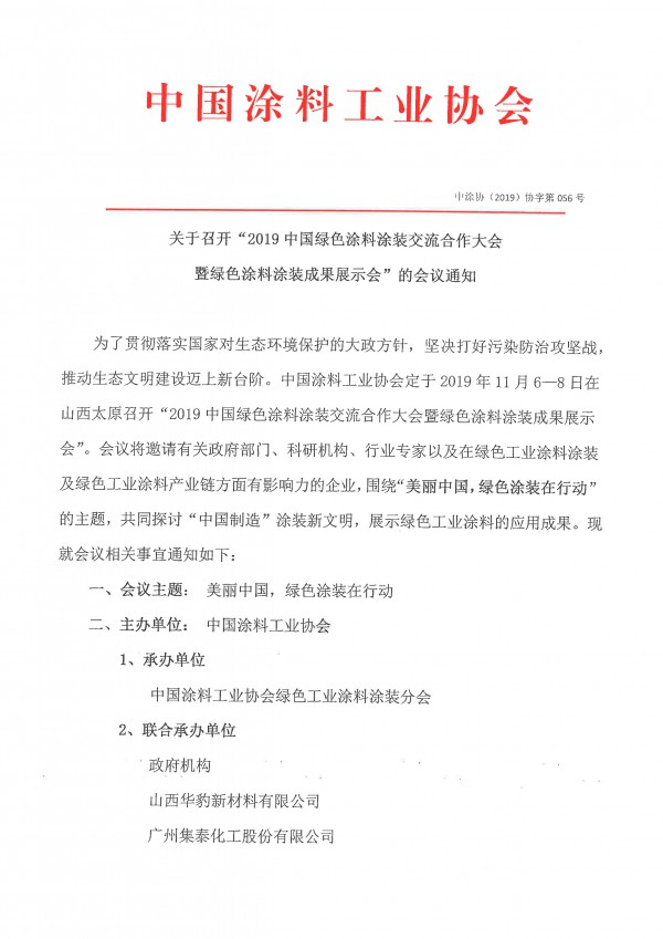 为了贯彻落实国家对生态环境保护的大政方针,坚决打好污染防治攻坚战,推动生态文明建设迈上新台阶。best365中国官方网站定于2019年11月6 - 8日在山西太原召开“2019中国绿色涂料涂装交流合作大会暨绿色涂料涂装成果展示会”。会议将邀请有关政府部门、科研机构、行业专家以及在绿色工业涂料涂装及绿色工业涂料产业链方面有影响力的企业,围绕“美丽中国,绿色涂装在行动”的主题,共同探讨“中国制造”涂装新文明,展示绿色工业涂料的应用成果。现就会议相关事宜通知如下: