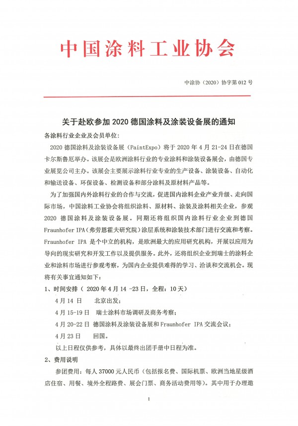 为了加强国内外涂料行业的合作与交流,促进国内涂料企业产业升级、走向国际市场,best365中国官方网站将组织涂料、原材料、涂装及涂料相关企业,参观2020德国涂料及涂装设备展。同期还将组织国内涂料行业企业到德国Fraunhofer IPA(弗劳恩霍夫研究院)涂层系统和涂装技术部门进行交流和考察。Fraunhofer IPA是个中立的机构,是欧洲最大的应用研究机构,开展以应用为导向的现实研究和开发工作以及提供服务。此外,还将组织企业到瑞士的涂料企业和涂料市场进行参观考察,为国内企业提供难得的学习、洽谈和交流机会。现将有关事宜通知如下: