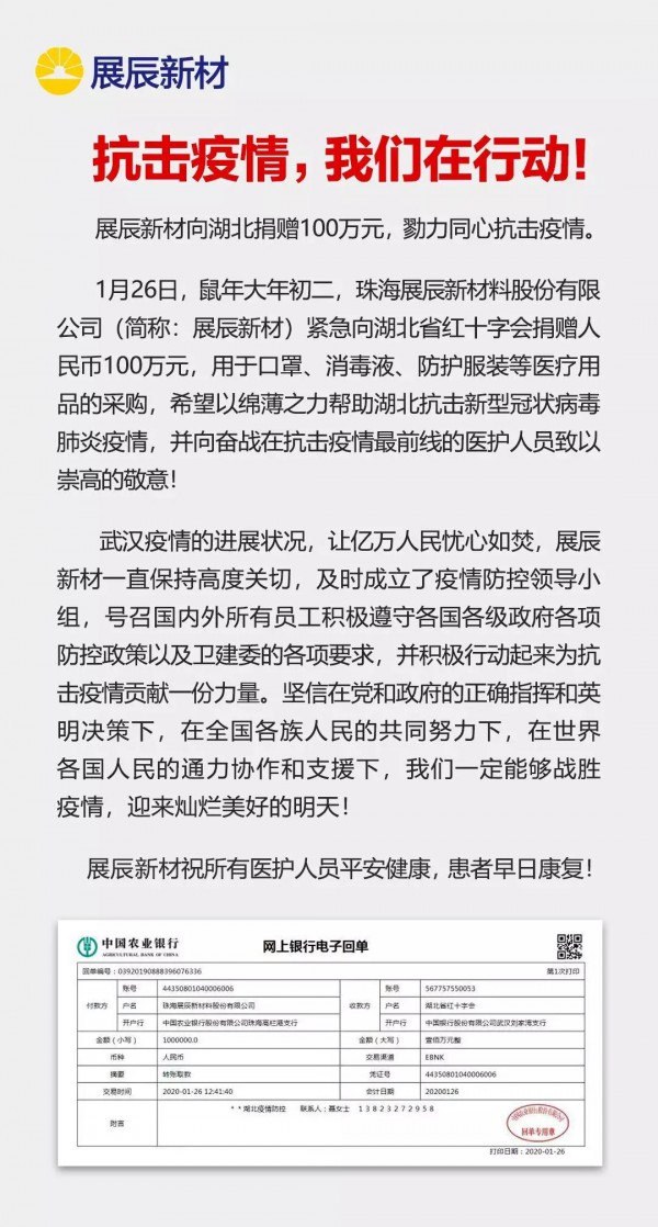 1月26日,鼠年大年初二,珠海展辰新材料股份有限公司(简称:展辰新材)紧急向湖北省红十字会捐赠人民币100万元,用于口罩、消毒液、防护服装等医疗用品的采购,希望以绵薄之力帮助湖北抗击新型冠状病毒肺炎疫情,并向奋战在抗击疫情最前线的医护人员致以崇高的敬意!