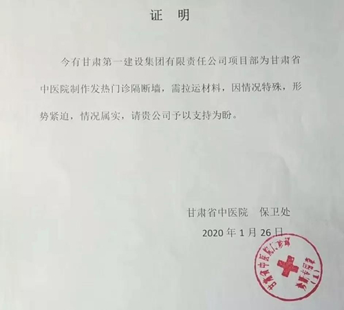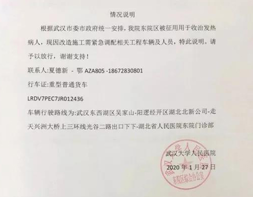 下午15点32分,车辆赶往厂区,开始装货。拿到通行证后,装满“龙牌”环保建筑材料的车辆终于在18:30到达武汉省人民医院。在这样的特殊情况下,北新人按项目要求用不到5小时时间,将所需材料送达,得到了医院和中建三局的肯定和表扬。