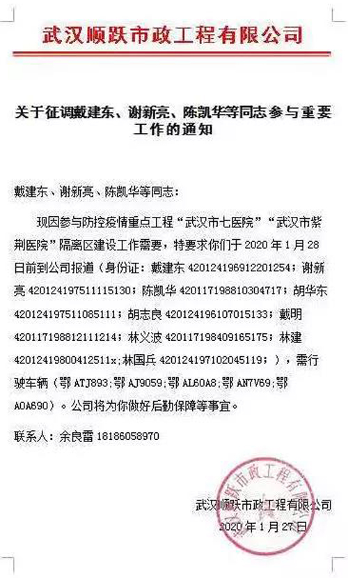 1月27日大年初三,下午1点41分,湖北北新建材接到中建三局工程总承包公司科教文卫事业部负责人电话,湖北省人民医院(又称“武汉大学人民医院”)东院急需进行新冠状病毒肺炎隔离区建设,需要立即发石膏板、龙骨及配套材料。当时北新建材武汉员工都在放假和自我隔离,但接到电话的第一时间,北新建材立即组织相关人员分工合作,联系物流,召集相关人员回工厂准备货源及相关合格证检测报告等手续。