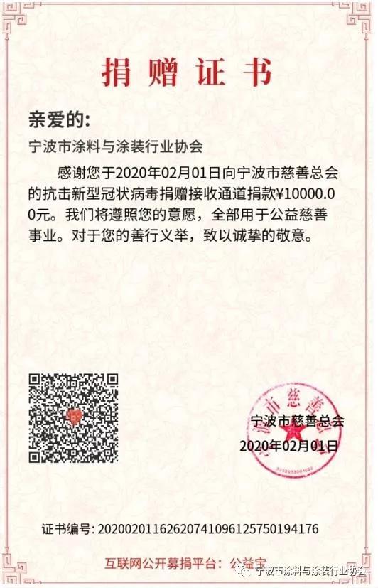 截至2月2日止,宁波涂协共收到会员个人捐款141413元,其中,第一批捐赠款101913元于2月1日晚通过宁波市慈善总会定向捐赠宁波市华美医院,第二批通过对公账户的捐赠款待正式复工后汇出。同时,会员企业通过向宁波市红十字会等途径直行捐款36万元;捐赠消毒液价值4万多元,捐赠口罩2000个等物资。