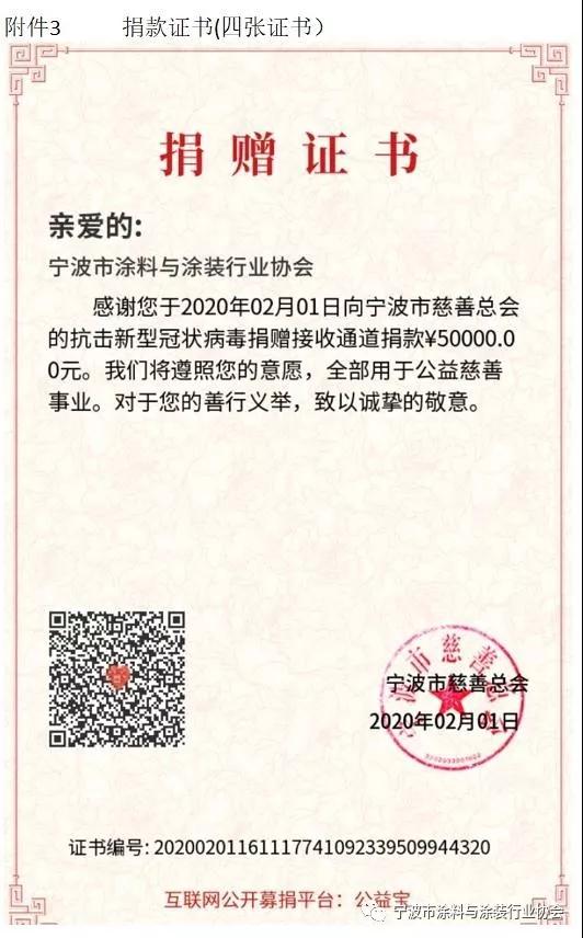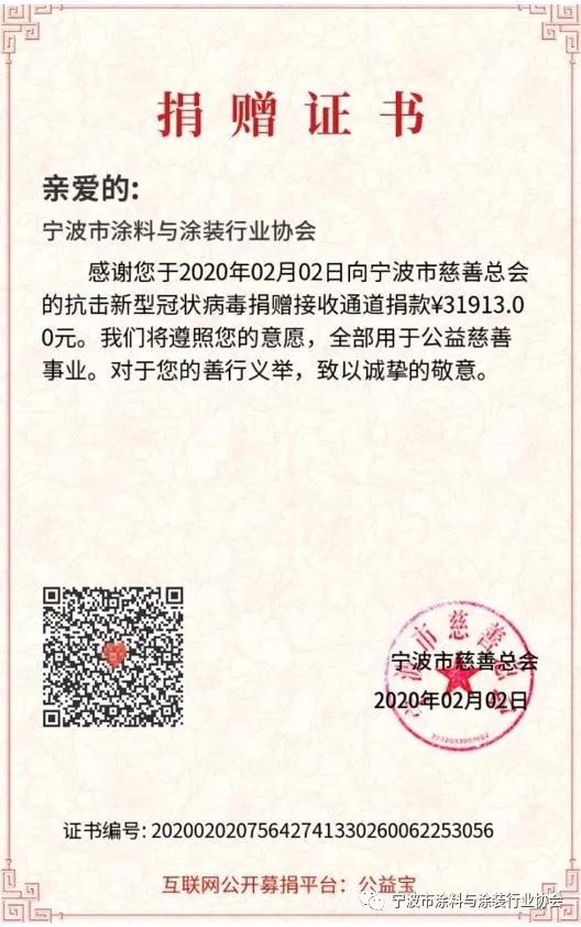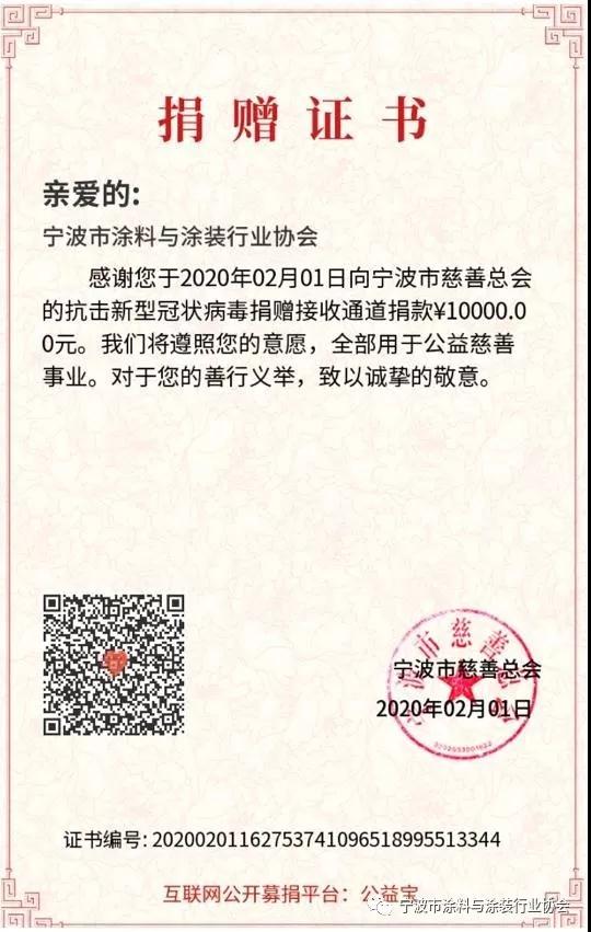 共同抗击疫情,宁波市涂料与涂装行业协会于2020年1月31日发出《抗击新型冠状病毒捐款捐物倡议书》,全体会员企业快速响应,积极捐款捐物,发扬有担当有责任的企业家情怀和强烈的社会责任感,积极支援疫情防控工作。