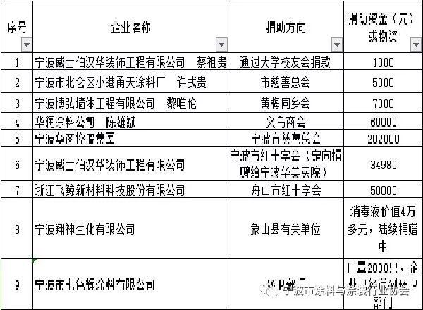 其中,宁波涂协9家会员企业直接捐款捐物情况为: