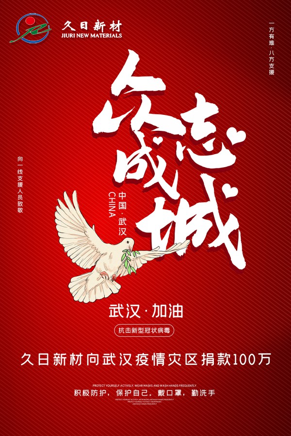 面对紧迫疫情,天津久日新材料股份有限公司(以下简称“久日新材”)积极响应中央决策部署和天津市委要求,做好自身企业和员工防护的同时,积极投身疫情防控工作,迅速部署,并向疫区伸出了援助之手,以实际行动展现了一个上市公司的社会责任。2020年1月31日,久日新材通过天津市慈善协会向武汉疫情灾区捐款100万元,用于武汉市新型冠状病毒肺炎疫情的防控与救治。