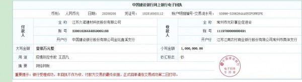 万众一心,众志成城。2020年2月5日,久诺人向常州市光彩事业促进会捐助100万元现金,用于武汉等地区疫情防控工作。目前该笔款项已经到账!