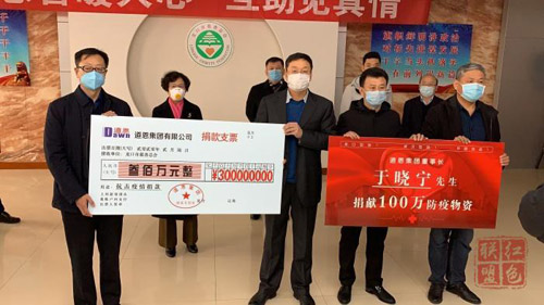 2月6日上午,在龙口市行政中心捐赠仪式现场,道恩集团向龙口市慈善总会捐赠300万元现金,道恩集团董事长于晓宁个人捐献100万元防疫物资。