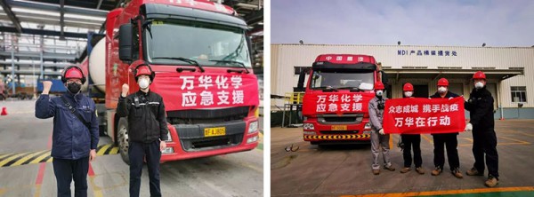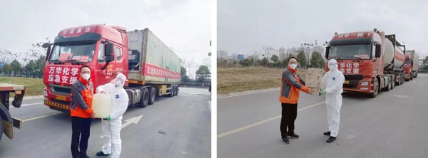 2月7日,为确保后期防疫医疗项目建设的顺利开展,保障客户生产,承载着万华化学祝福与支持的原材料抵达湖北襄阳,随车运送的还有口罩、消毒液等防护用品。