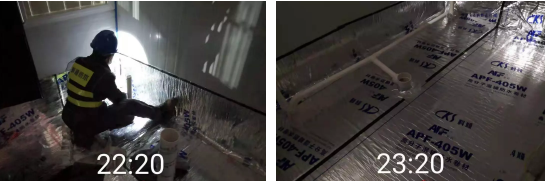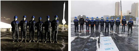 从黑夜到白天——抢工病房区屋面防水,早上开始施工,通宵抢工至次日下午五点半,连续工作30小时。