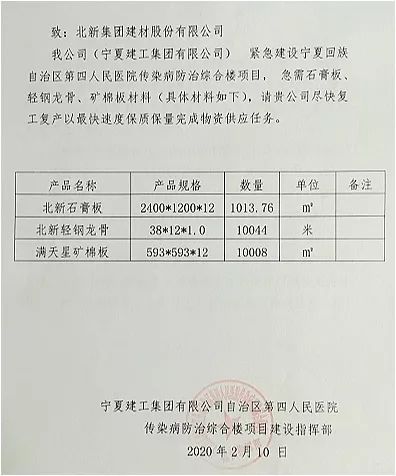 继积极支援北京、郑州、西安、珠海等全国多地“小汤山”医院建设项目后,北新建材还时刻关注着西北地区“小汤山”医院项目的建设。2月10日,在接到“宁夏版小汤山”医院——宁夏第四人民医院的紧急征调函后,北新建材西北公司快速反应,根据项目需求,利用现有产品库存,制定出最佳产品配置方案,仅用半天时间就组织完成全部物资的调配。
