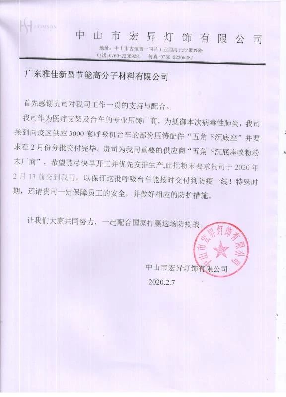 目前新冠肺炎病毒肆虐,全国人民各行各业紧急投入到抗击新冠疫情战斗中,雅佳也不例外,在鹤山工业城(共和镇)的大力支持和指导下紧急复工,抓紧生产武汉重疫区急需的呼吸机等医疗设备抗菌粉末涂料,为抗击新冠肺炎病毒做出了应有的贡献。