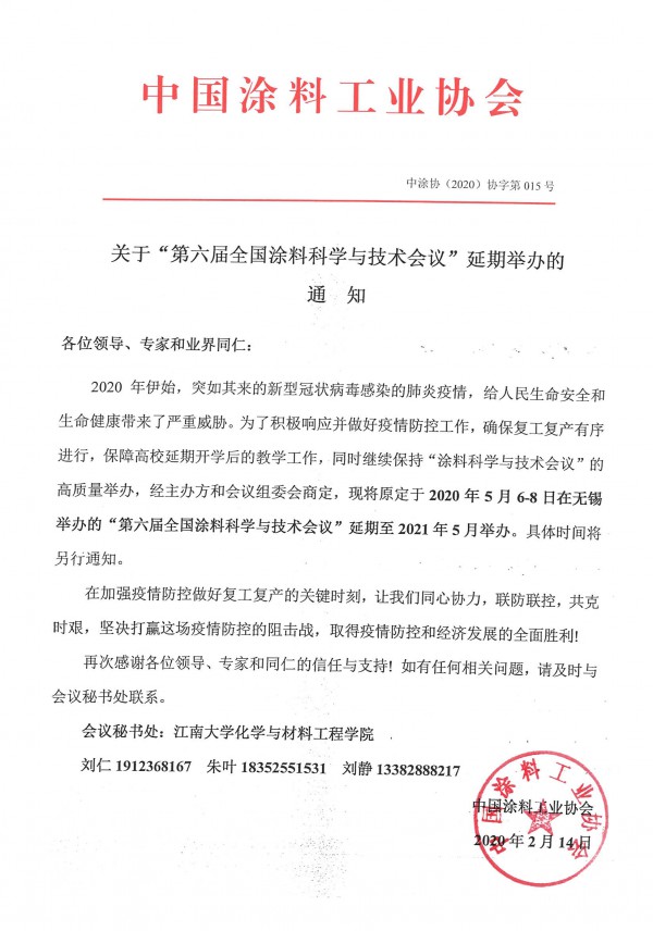 2020年伊始,突如其来的新型冠状病毒感染的肺炎疫情,给人民生命安全和生命健康带来了严重威胁。为了积极响应并做好疫情防控工作,确保复工复产有序进行,保障高校延期开学后的教学工作,同时继续保持“涂料科学与技术会议”的高质量举办,经主办方和会议组委会商定,现将原定于2020年5月6-8日在无锡举办的“第六届全国涂料科学与技术会议”延期至2021年5月举办。具体时间将另行通知。