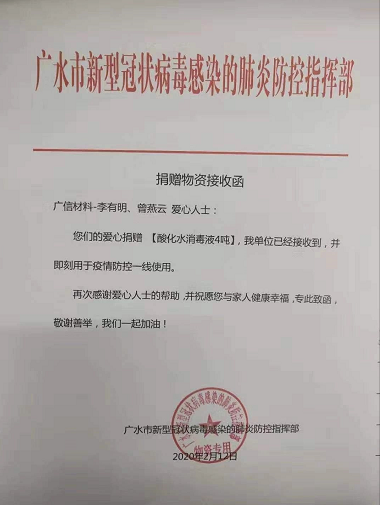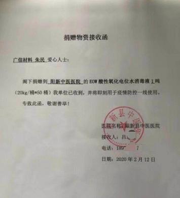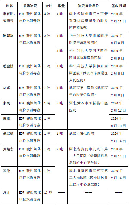 此外,除了公司对外捐赠,公司员工也一直积极通过捐钱捐物等方式为抗击疫情贡献自己的力量。经过与一线医护人员对接了解疫情防控物资需求情况及相关资源对接,截至2020年2月14日,公司相关董事、高管、子公司高管以个人自有资金采购并捐赠累计13吨EOW酸性氧化电位水消毒液,并已送至湖北武汉、黄冈、黄石、广水等地相关医院及防疫相关部门,支援一线医护人员抗击新型冠状病毒疫情。