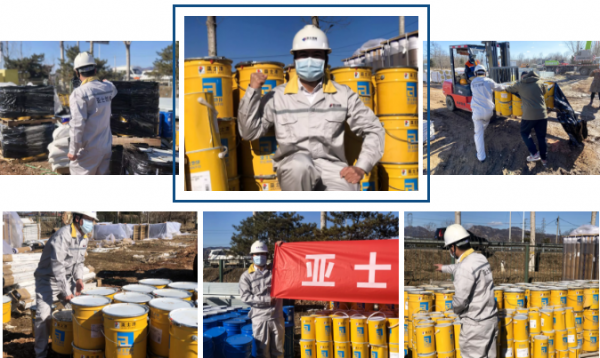亚士战略合作部、北方销售大区员工,不顾刺骨寒风,积极投入到卸货和技术交底之中,以最快的速度将这批援建的亚士环氧地坪产品移交给小汤山项目部。