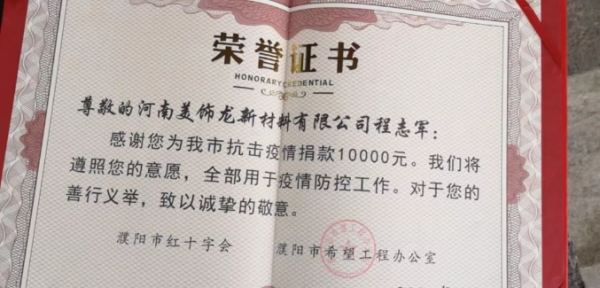 协会常务理事单位——河南美饰龙新材料有限公司继上次捐赠后,再次伸出援助之手,在团市委和青企协组织下,向濮阳市红十字会和濮阳市希望工程捐赠人民币1万元,为疫情防控工作贡献一份力量。