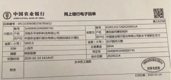 协会会员单位——河南永华涂料科技有限公司积极履行社会责任,奉献爱心,号召公司党员和干部职工积极参与到抗击疫情行动中来,为驻地卡点捐赠棉衣60件,为政府捐款人民币25800元(其中公司捐款2万元,员工捐款5800元)。