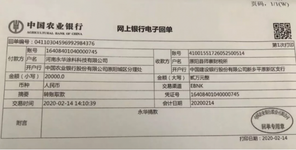 “面对严峻的疫情防控形势,企业应该有一份担当和责任,只要全县人民众志成城、同舟共济,就一定能打赢这场疫情防控狙击战!”协会副会长单位——南阳星港涂料有限公司积极响应政府号召,向镇平县红十字会捐助人民币10万元用于疫情防控。
