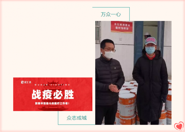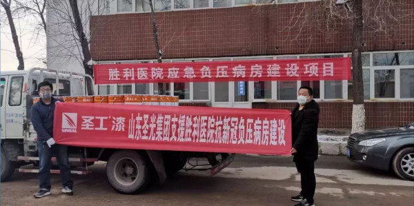 2月15日,东营市胜利医院负压病房建设指挥部来电获知马上开工建设的负压隔离病房工程急需一批涂料时,公司领导第一时间作出此项工程所需防火涂料圣光集团全部捐赠的决定,立即部署安排专人具体对接,于当日下午将工程急需的第一批防火涂料送至建设工地,并指派专职技术服务人员为工程总包方胜利建设提供施工过程技术支持。