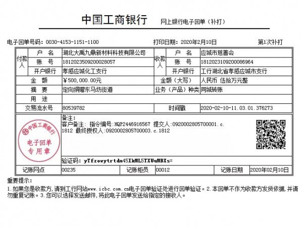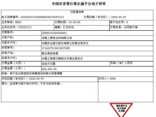 2月7日,向河南省南召县财政局捐款50万元,用于应对新型冠状病毒感染的肺炎疫情;