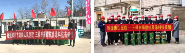 另外,三棵树还分别向宁夏银川市第四人民医院、福建龙岩康山医院、安徽省宿州市第三人民医院,捐赠了健康涂料,驰援医院建设项目。