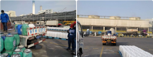 面对众多等待万华支援消毒液的企业客户,万华人每一项服务都力求做到最好。为提升运输效率,万华支持送货和自提两种供应方式。在芝罘、福山、蓬莱、栖霞等地,万华免费送货上门,有时候一个司机一天要跑两个市区送货,到了目的地还帮忙卸货,用最优质的物流服务支援各地企业。有条件的企业来到万华自提,这虽然减少了物流的压力,但是五花八门的消毒液容器对接起来,难度不小。万华及时改装灌装用具、统一贴好标签、安排装货、核对消毒液重量……自提灌装工作在现场员工的共同协作下有条不紊地进行着。万华还准备了使用和质量说明书,力求用最贴心细致的服务给予大家最有力的支持。