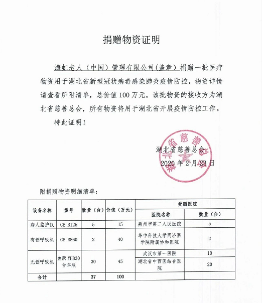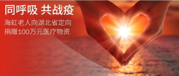 2月23日,海虹老人向湖北省慈善总会定向捐赠了一批总价值100万元的医疗物资,用于湖北省新型冠状病毒感染肺炎疫情防控。
