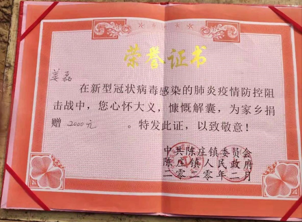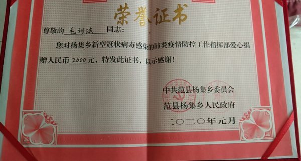 协会常务理事单位——河南中显贸易有限公司,在疫情防控期间,心怀大义,奉献爱心,向濮阳市陈庄镇人民政府捐款人民币2000元,支持一线的疫情防控工作。