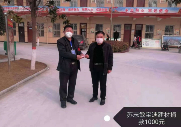 协会理事单位——河南宝迪建材有限公司牢记社会使命,伸出爱心之手,向荥阳市城关乡李克寨村委会捐款人民币1000元,助力疫情防控工作。