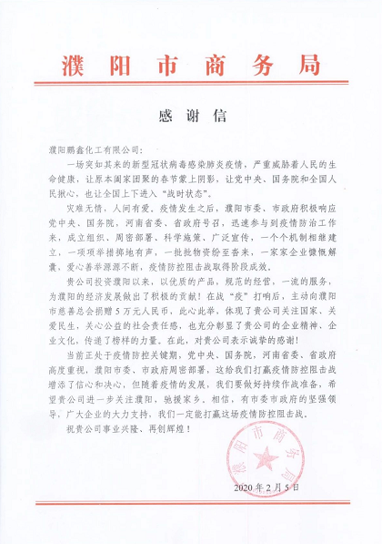协会会员——濮阳鹏鑫化工有限公司积极响应政府号召,疫情发生后,迅速参与到疫情防治工作中来,主动向濮阳市慈善总会捐款人民币5万元,以实际行动支援抗疫工作。