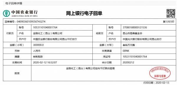 金刚化工(昆山)有限公司向“昆山市慈善基金会”捐款30万元