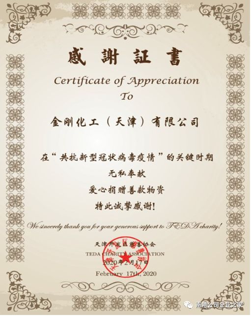 金刚化工(天津)有限公司向“天津开发区慈善协会”捐款10万元