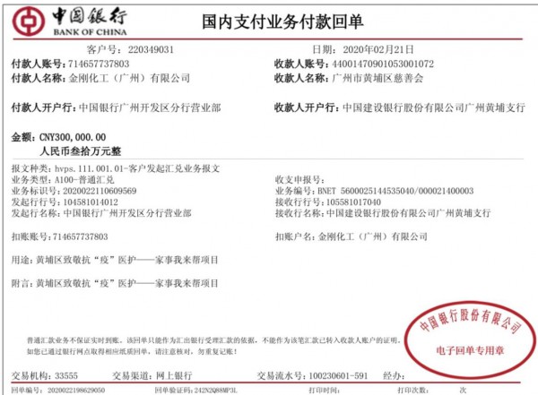 金刚化工(广州)有限公司向“广州市黄埔区慈善会”捐款30万元