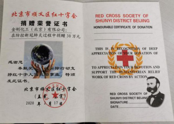 金刚化工(北京)有限公司向“北京市顺义区红十字会”捐款30万元