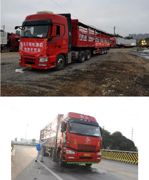 2月12日,芜湖东方雨虹协调调货,并集中对运输车辆进行消杀,连夜将所需物资送抵安陆普爱医院护国园区项目施工现场。