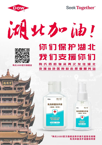 今天,陶氏1688官方旗舰店携手合作伙伴健贝星联名向湖北九家医院及社区志愿者团队捐赠一批免洗抑菌洗手凝露和喷雾,帮助他们在工作环境中加强个人防护。